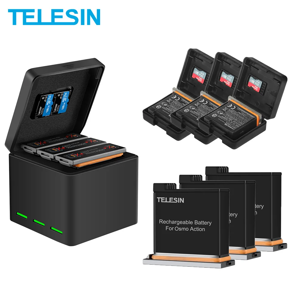 TELESIN 3 Pack Battery + 3 Slots Battery Charger 2 TF Card Storage Box for DJI Osmo Action Camera Accessories