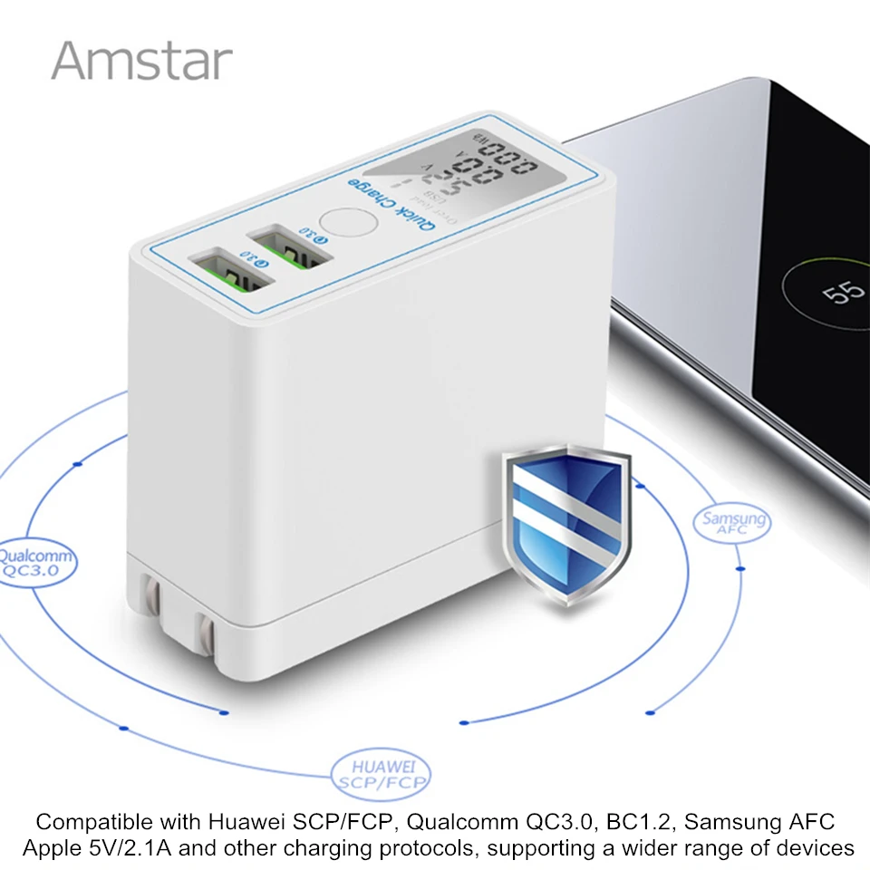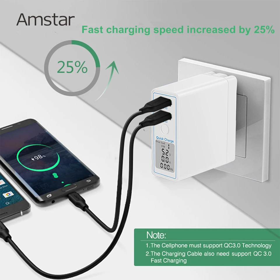 Big Promo Amstar 36W Quick Charge 3.0 Dual USB Charger Adapter Led Display QC 3.0 Travel Wall Charger for iPh