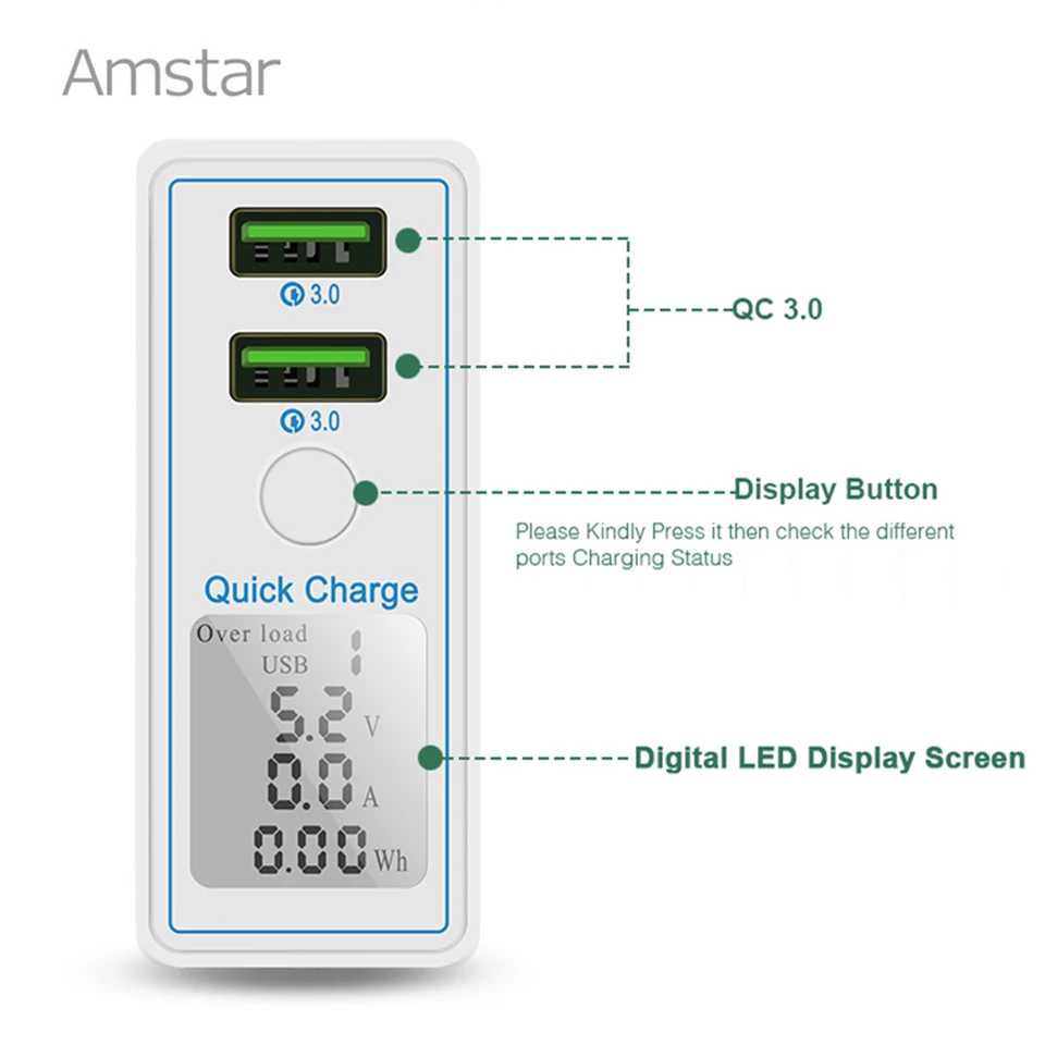 Amstar 40W Quick Charge 3.0 USB Charger Adapter 6-Ports Led Display QC3.0 USB Phone Charger for iPhone Samsung Huawei Xiaomi